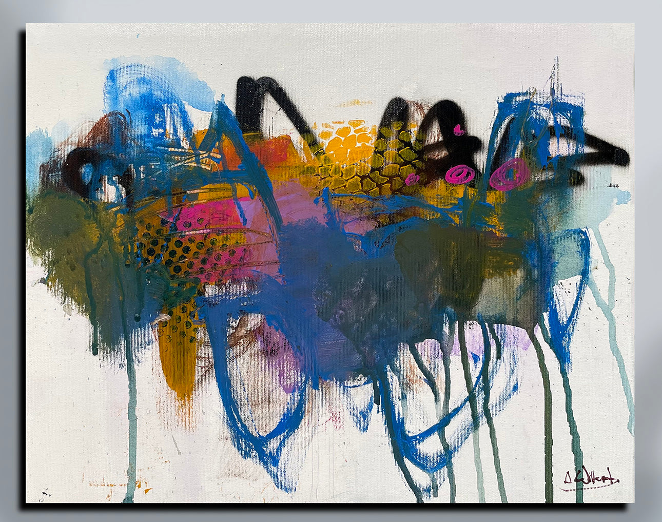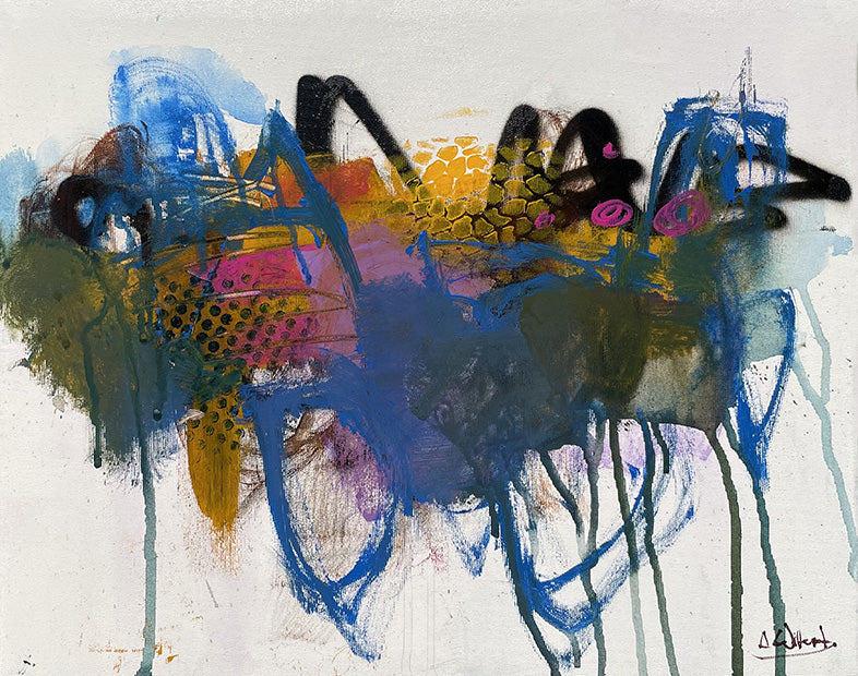 This is a 24 x 20 inch “ spraypaint and acrylic work of fun and movement, gloss varnished. This piece is being offered at 25% off the listed price. :) It's a lively, rhythmic painting which doesn’t need framing, [ but framing would make it more substantial for sure ;'}}} and sides are 1 and a half inches deep so it pops off the wall at a nice depth.