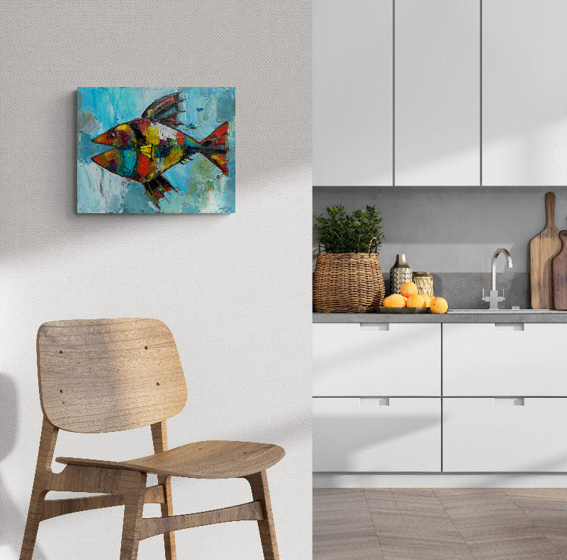 20 x 16 x 1.5 inches deep, this is a semi abstract textured acrylic painting of a salt water fish, though it has been able to mutate and thrive in rivers.