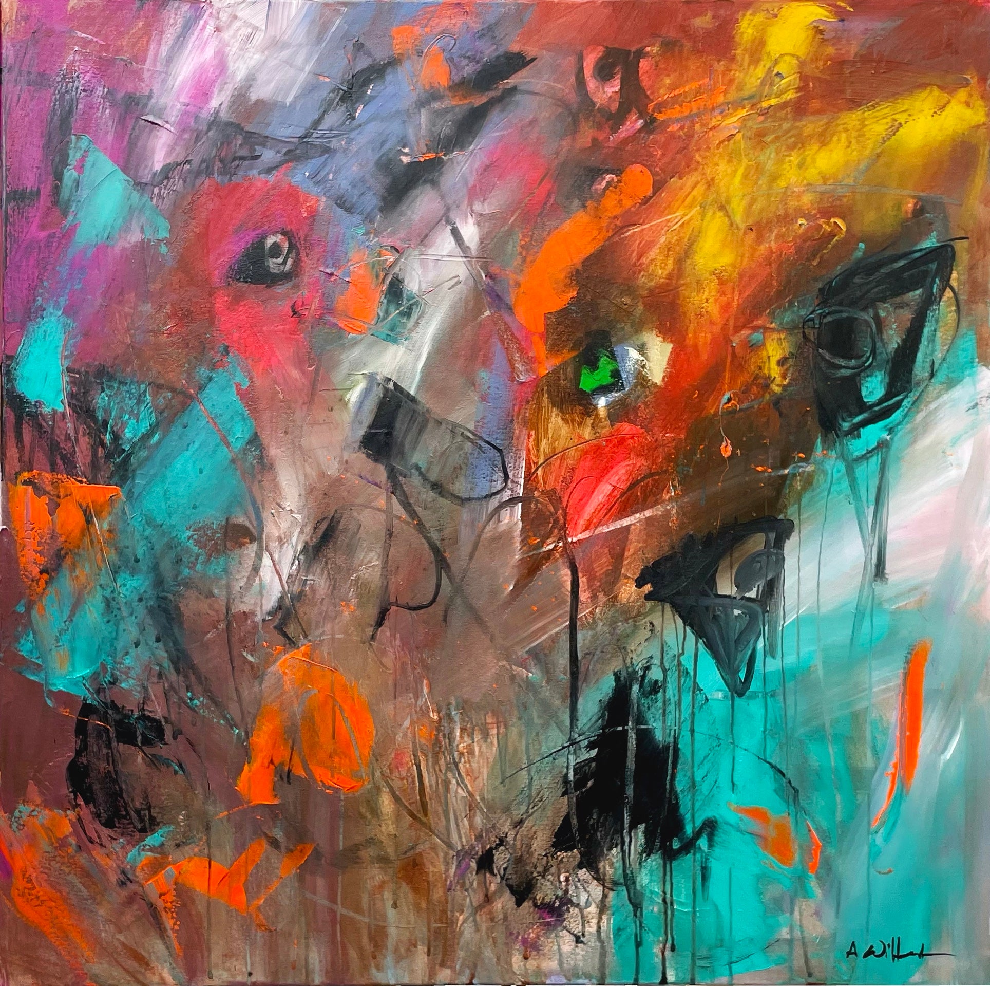 Upon closer inspection, subtle suggestions of fragmented faces or eyes emerge, adding an element of intrigue and evoking fleeting glimpses of hidden figures within the abstraction. The textured brushstrokes and deliberate drips of paint enhance the sense of spontaneity and emotion, encouraging personal interpretation and connection.