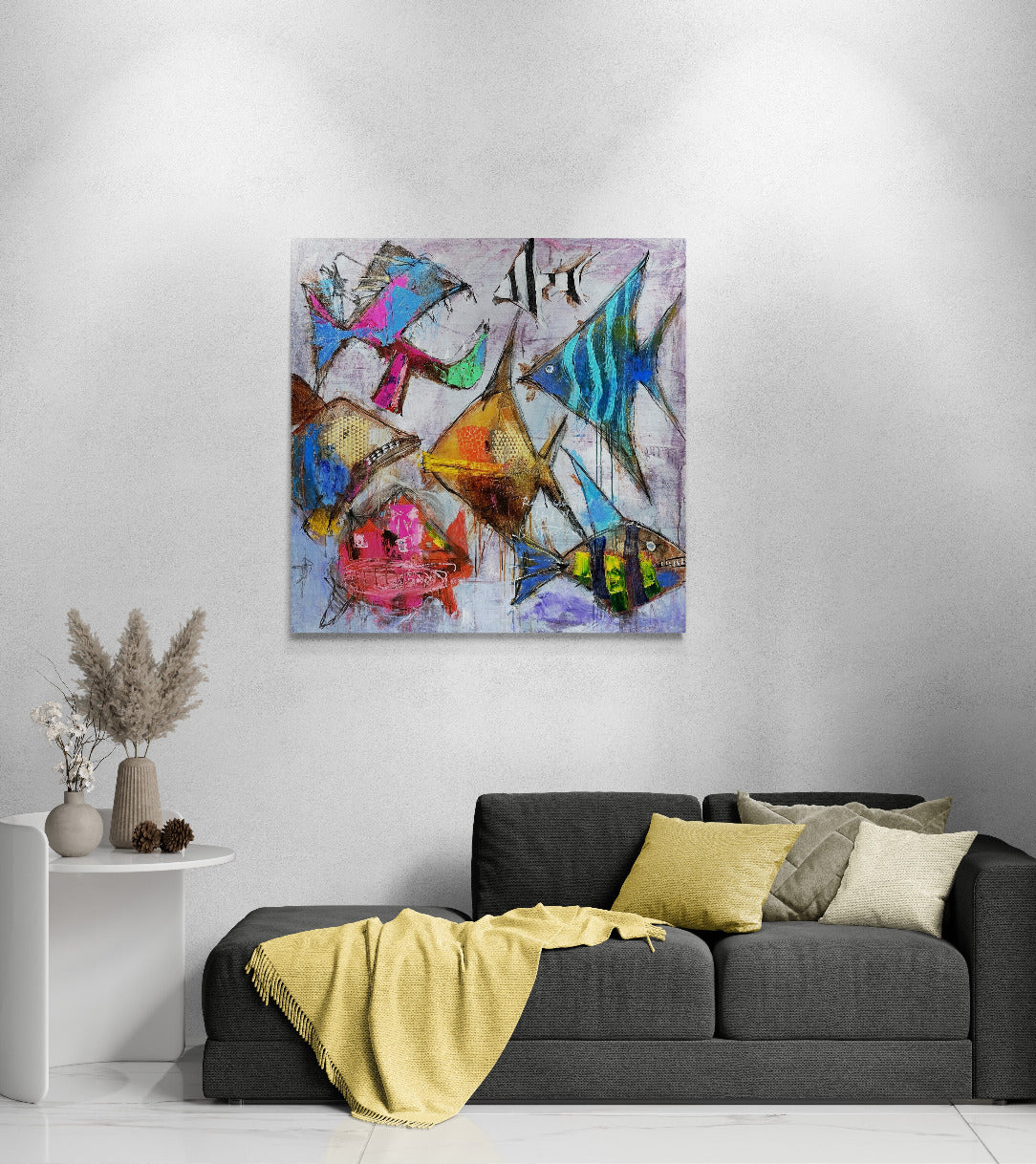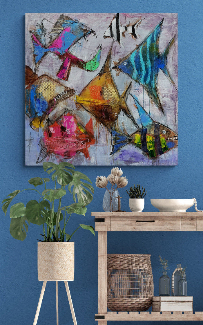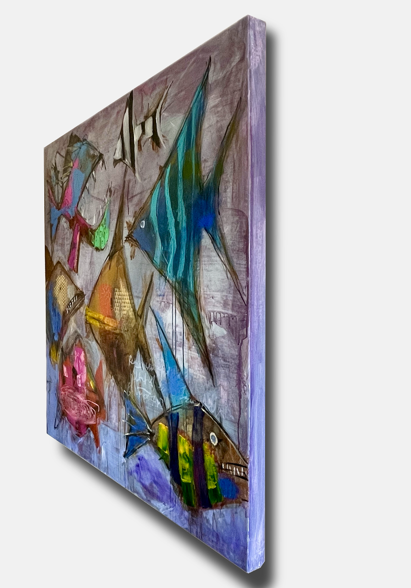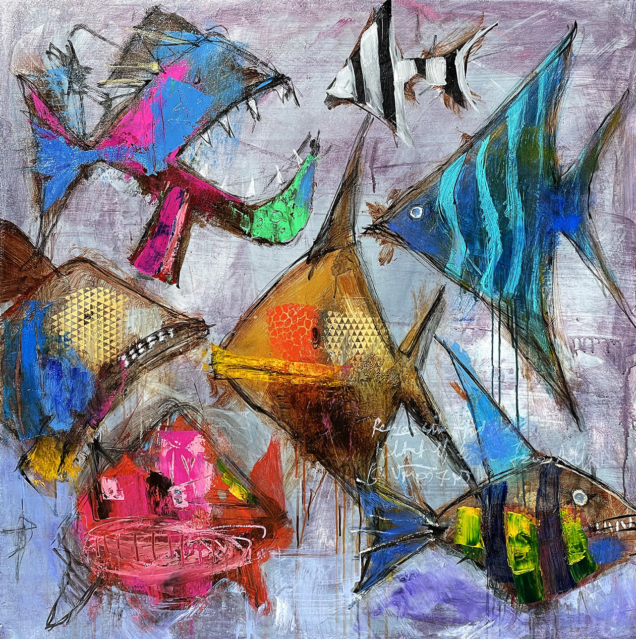 This large 100 x100 cm canvas has a translucent feel, and the characters offer a gentle humor. Contrasted with the painterly nature of layers of acrylic and subtle writing, are strong shapes. The painting showcases a mesmerizing interplay of aquatic life, with fish darting through the water in a lively competition. Masterful use of color and texture brings the underwater scene to life, capturing the fluidity and grace of the marine environment. The intricate details and vivid hues create a sense of movement and energy, making the viewer feel as though they are closely observing this underwater drama.