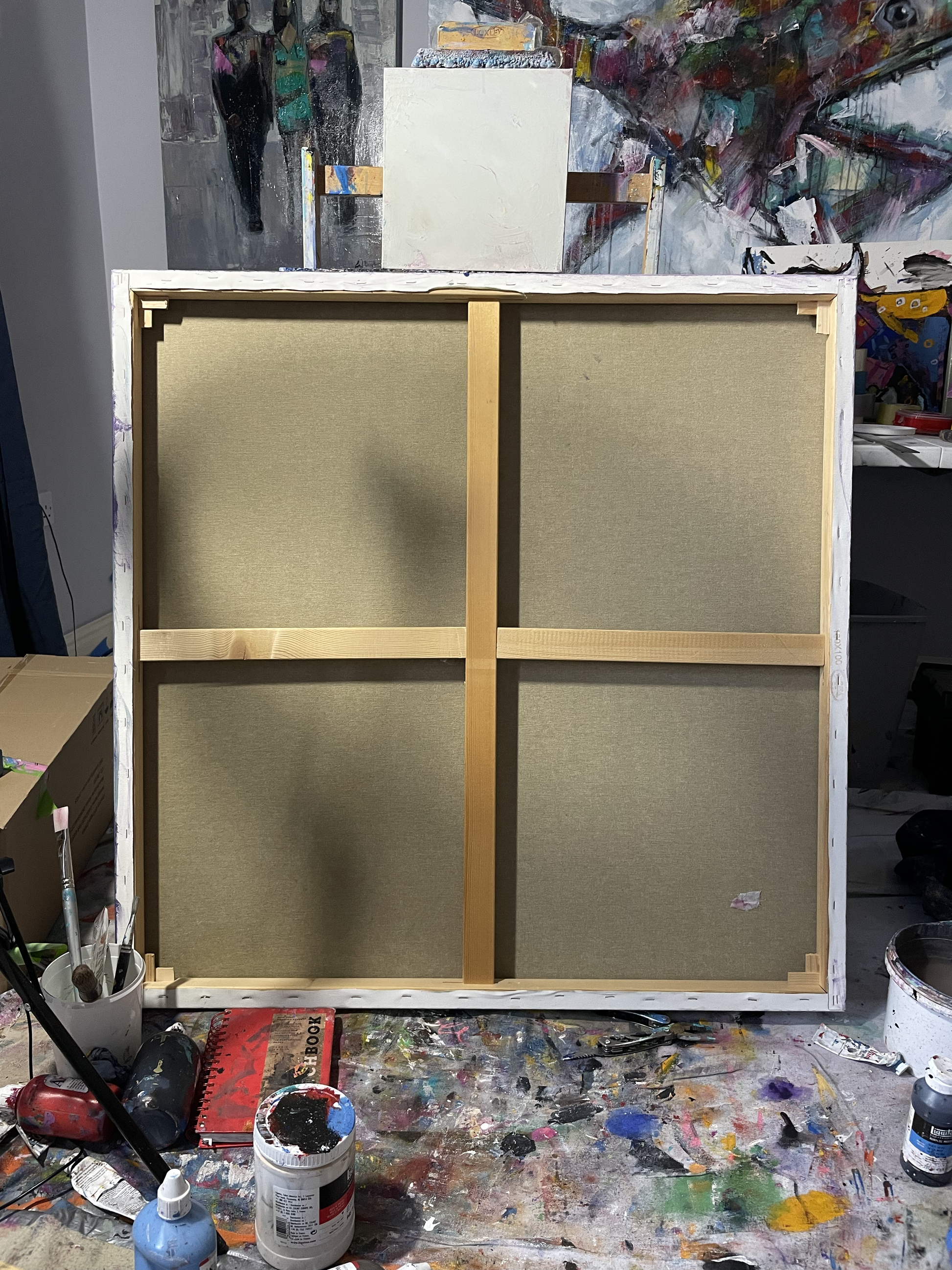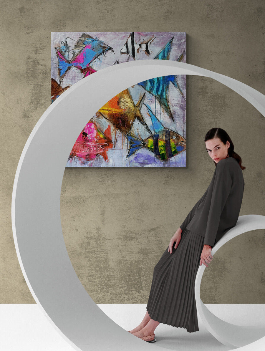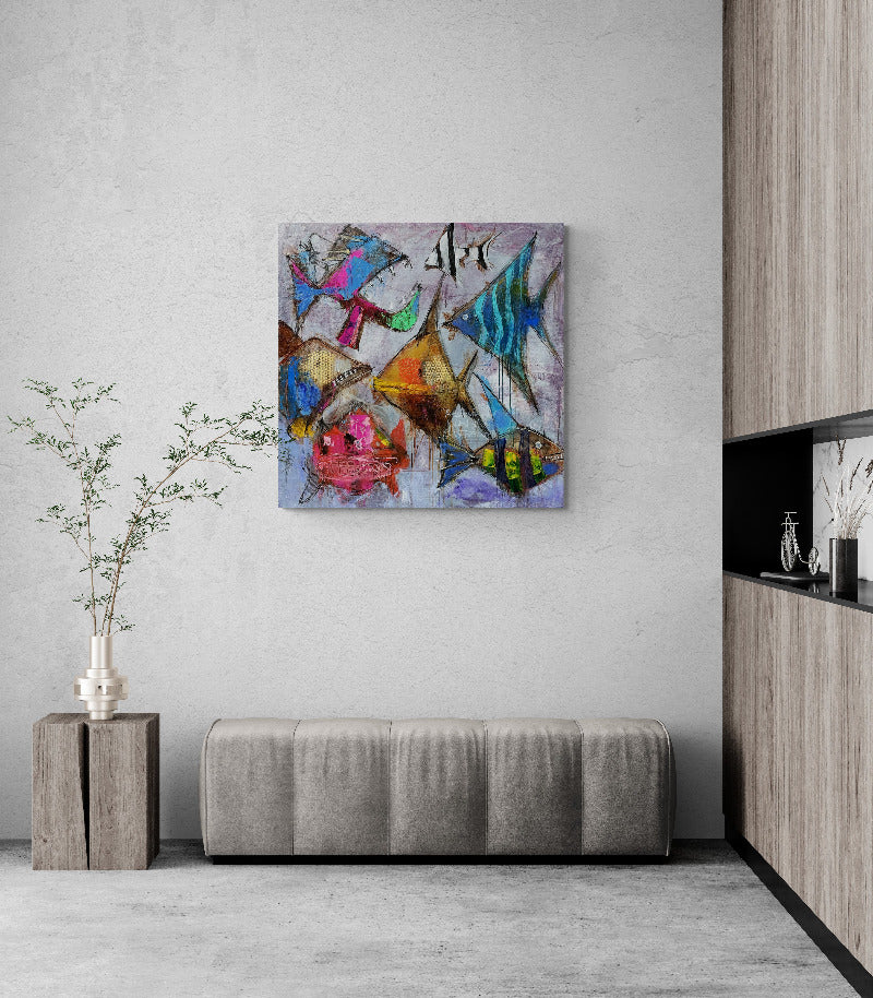 This large 100 x100 cm canvas has a translucent feel, and the characters offer a gentle humor. Contrasted with the painterly nature of layers of acrylic and subtle writing, are strong shapes. The painting showcases a mesmerizing interplay of aquatic life, with fish darting through the water in a lively competition. Masterful use of color and texture brings the underwater scene to life, capturing the fluidity and grace of the marine environment. The intricate details and vivid hues create a sense of movement and energy, making the viewer feel as though they are closely observing this underwater drama.