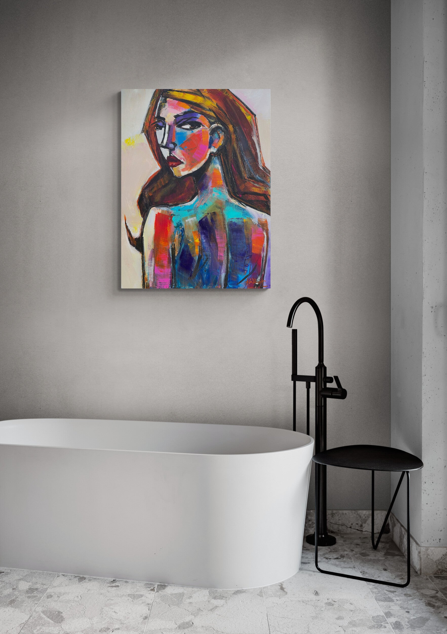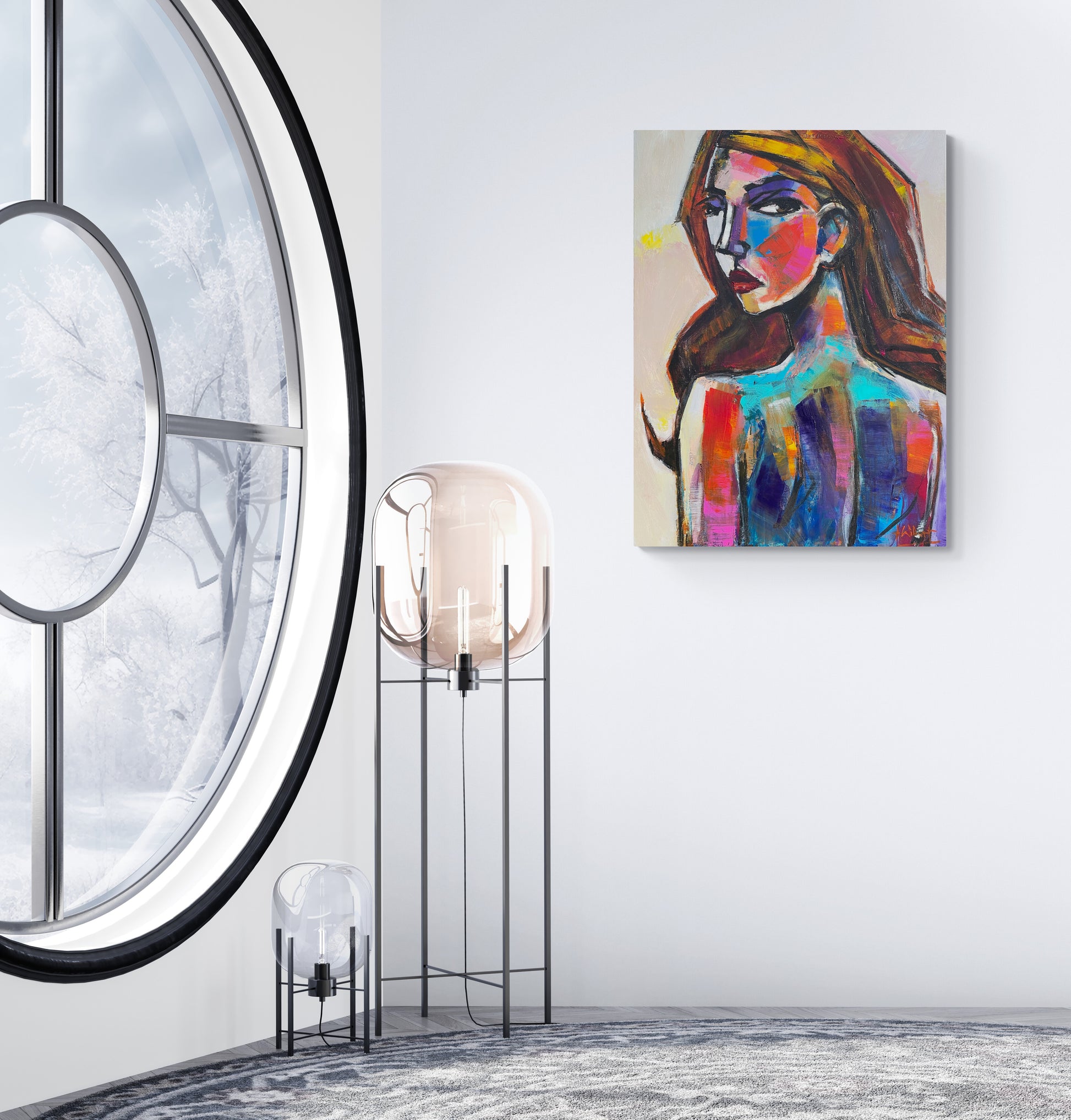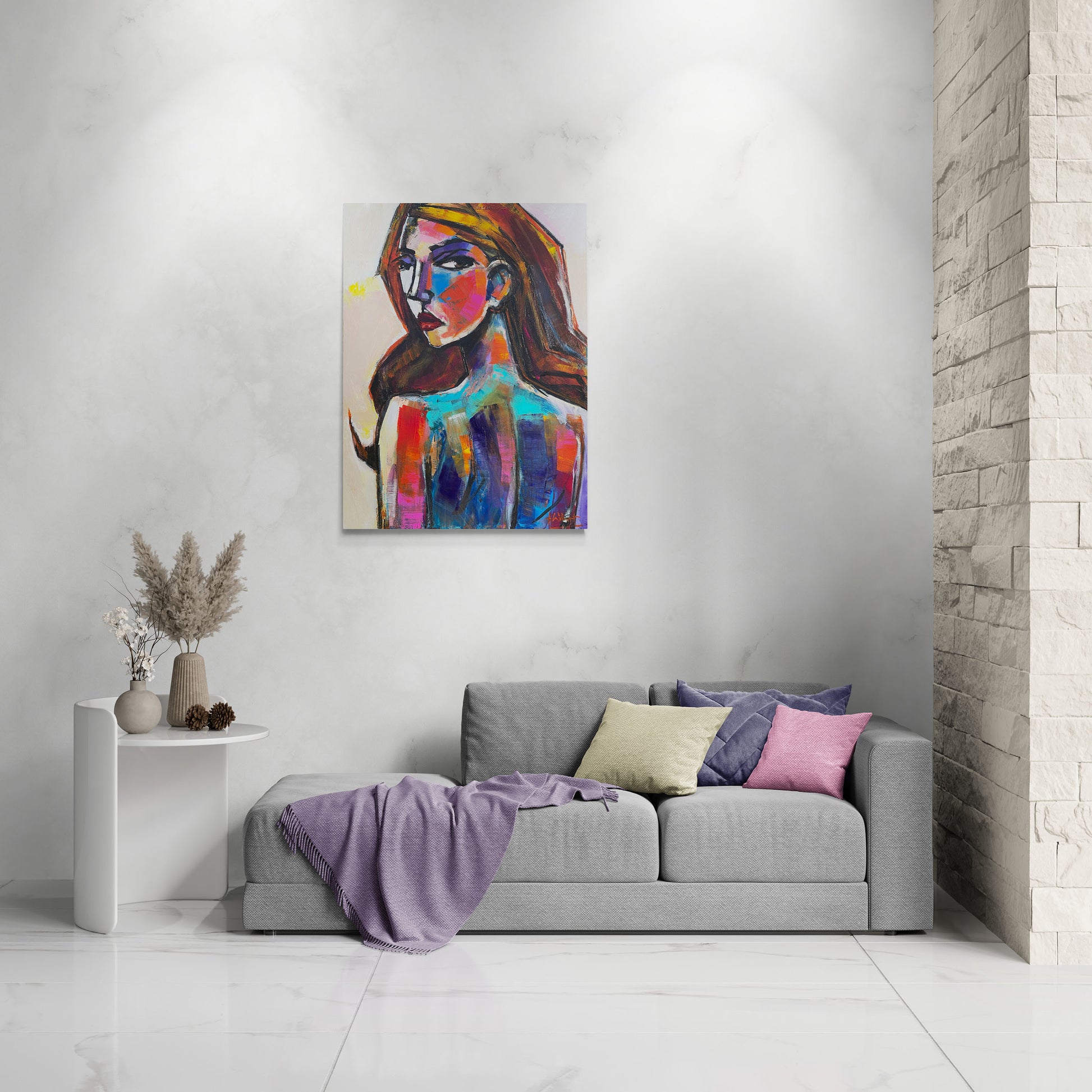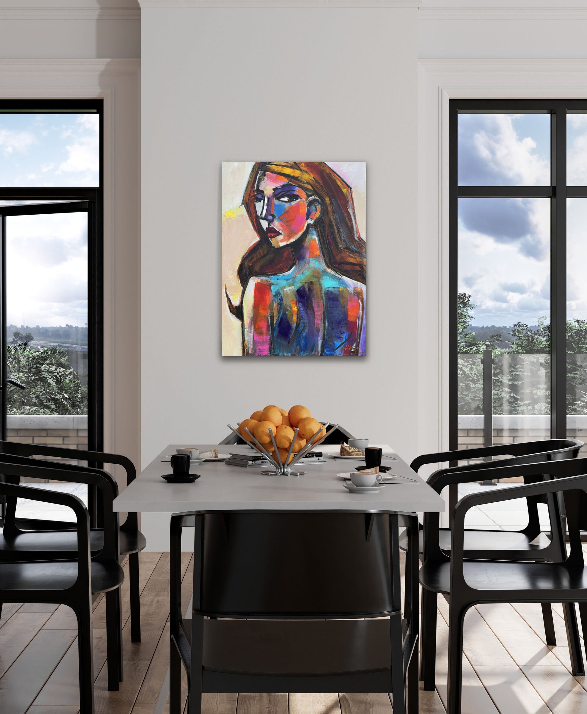 Acrylic on canvas, Abstract figurative of strong personaity turning her head to look at the viewer