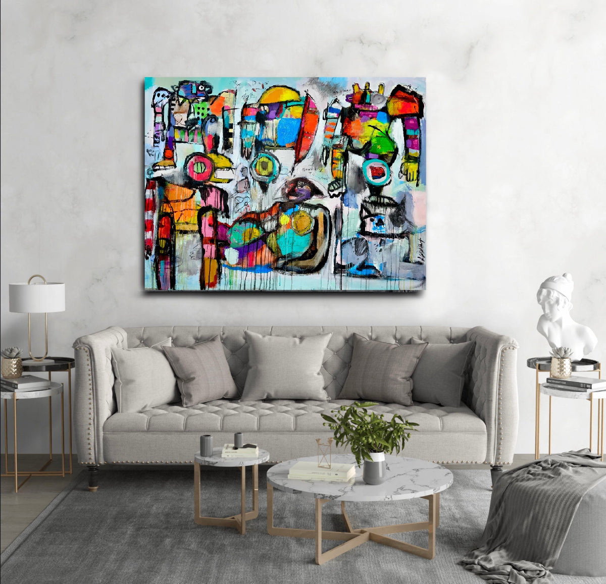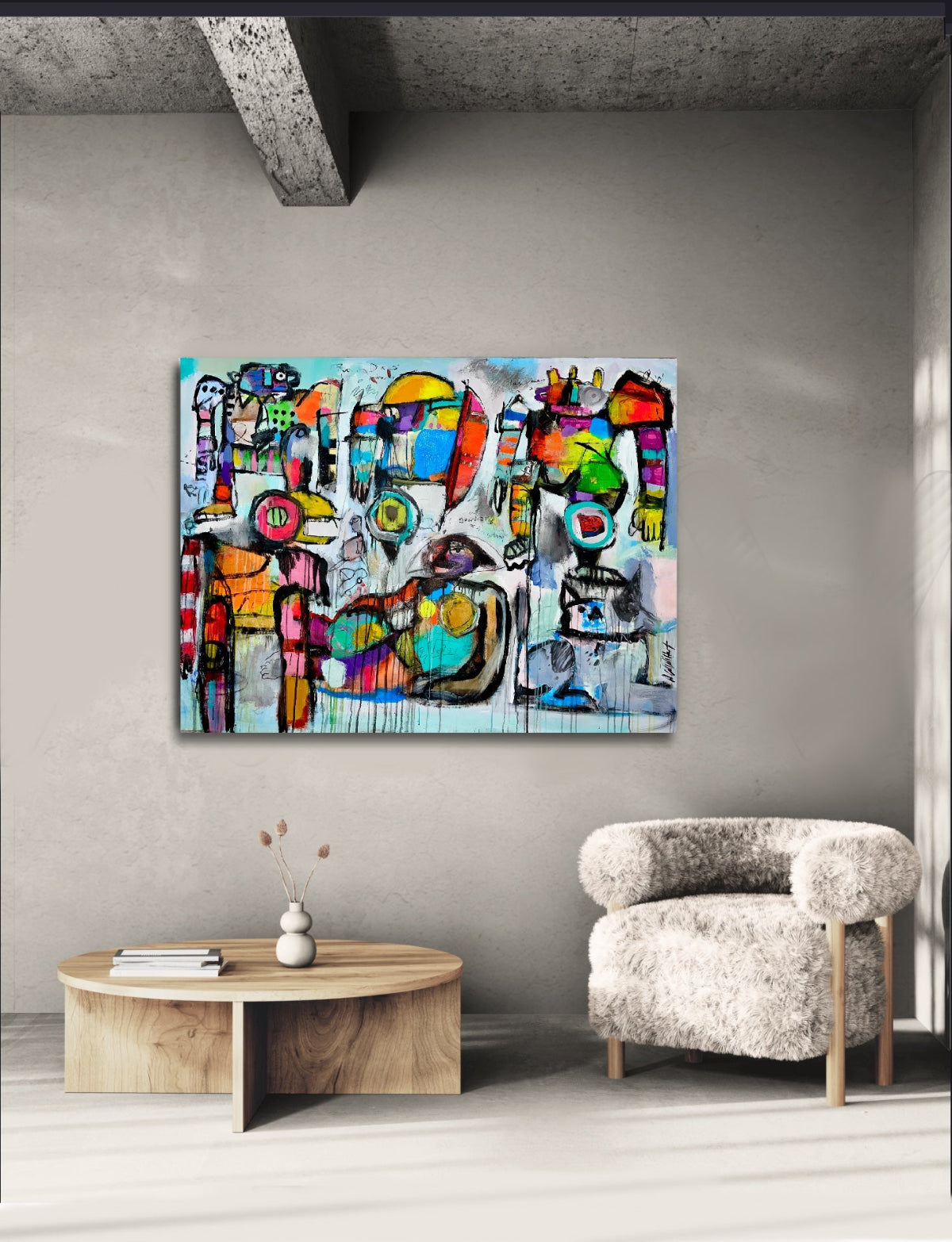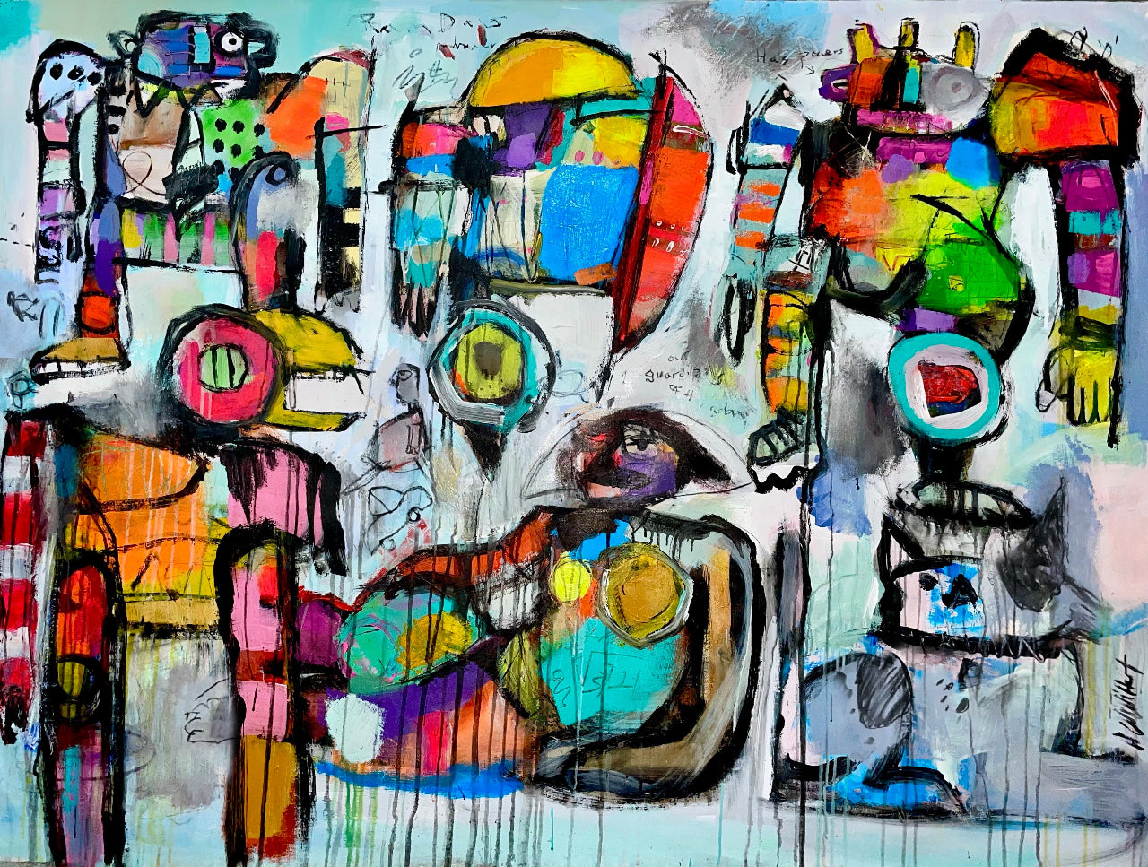 Introducing High Noon at the Office Canteen - a modern painting that brings energy and humor to any large wall space in your home or office. With bold brushstrokes and vivid colors, this eye-catching piece is sure to make a statement. Elevate your space with this sophisticated and exclusive addition. Price includes shipping.