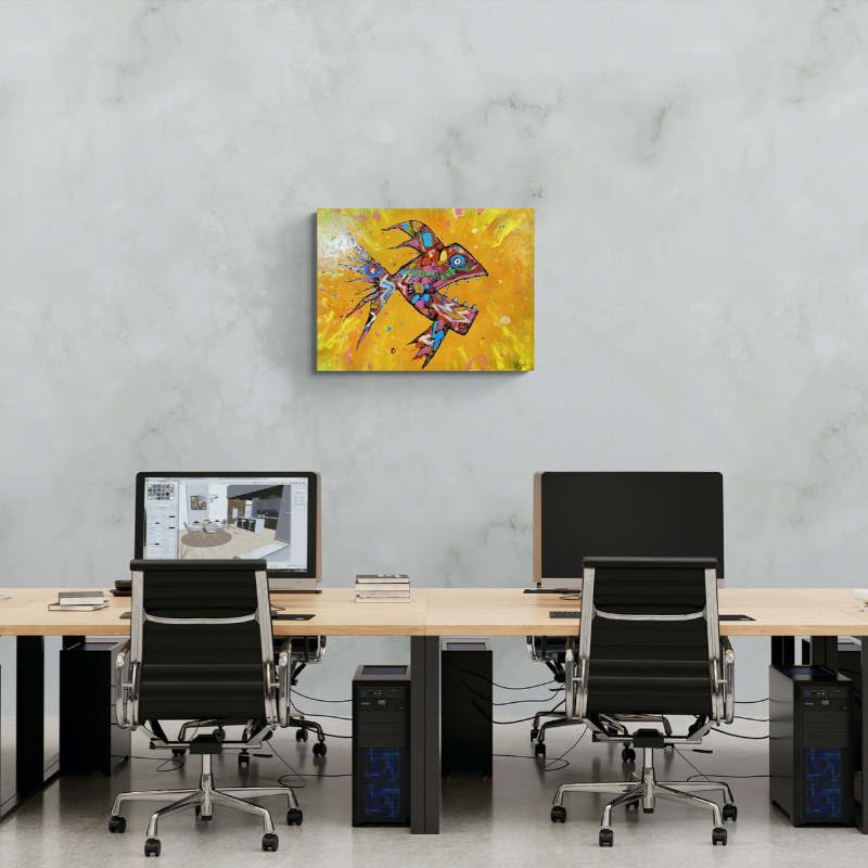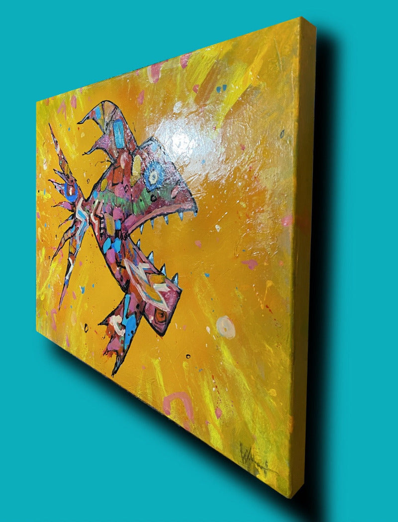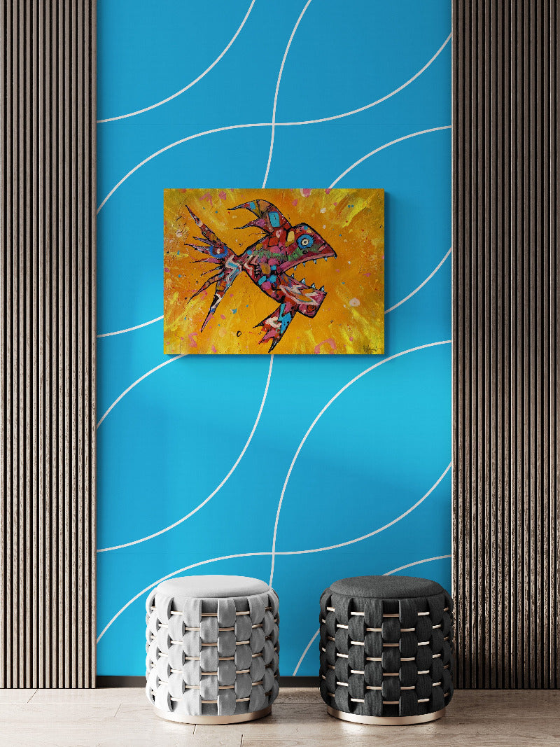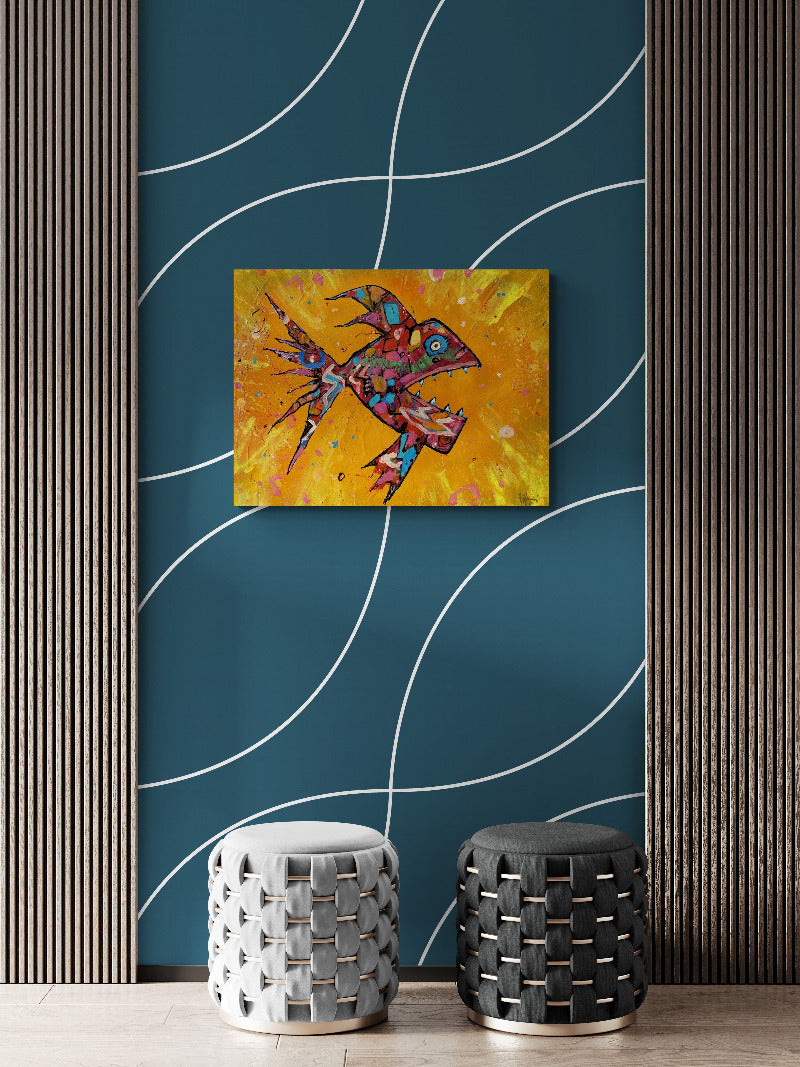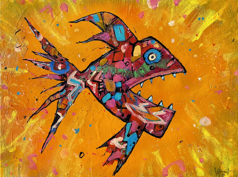32 x 24 '' acrylic and spraypaint on canvas. Excitement and danger in abstraction. Aquarium lovers, hunters and fishing sports people will love this reminder of their elusive prey. Capture it now, makes a great gift. On sale at Ugallery.com