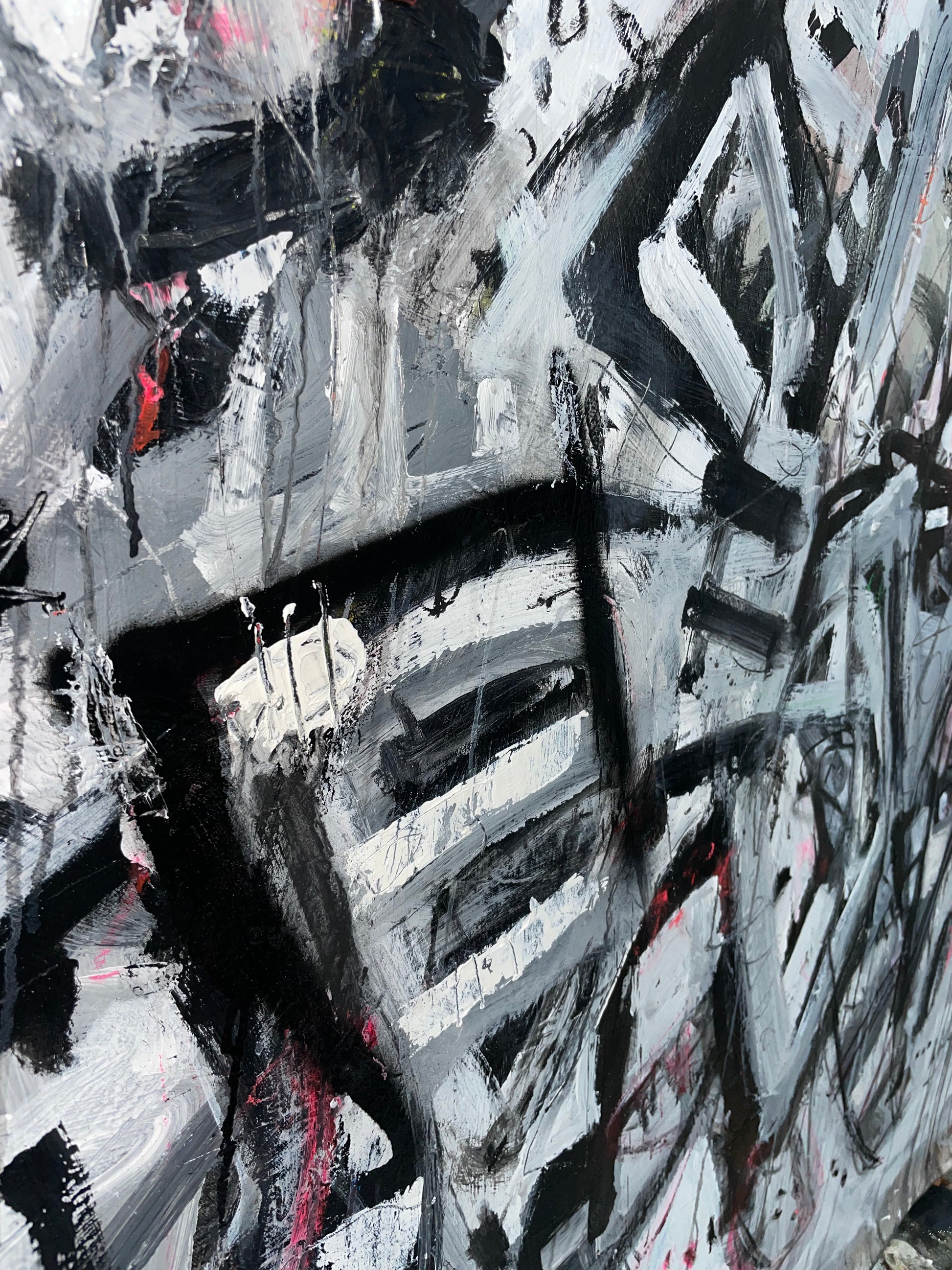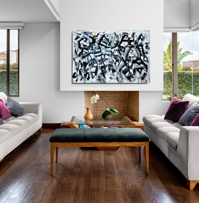 A dynamic exploration of movement and emotion, this piece embodies the breaking of creative constraints. Bold black strokes crash against the stark white background, echoing the artists unfiltered energy and uninhibited expression.