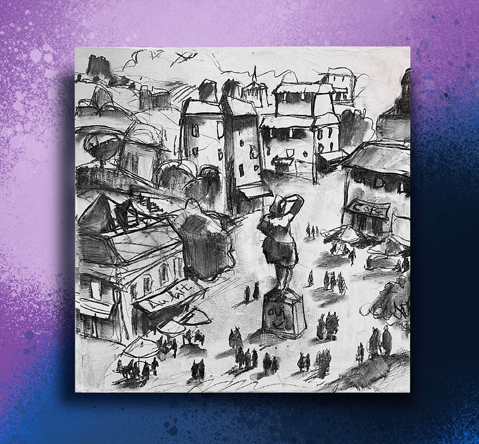 Charcoal on canvas 40 x 40 x 5 cm.This is not a factual event, it’s a charcoal drawing of an imaginary but possible scenario where a small French village decides to clothe their favourite town sculpture of a nude figure as it is now 2023, and they fear they would be accused of sexism and lose tourist dollars. Funny or contentious issue?