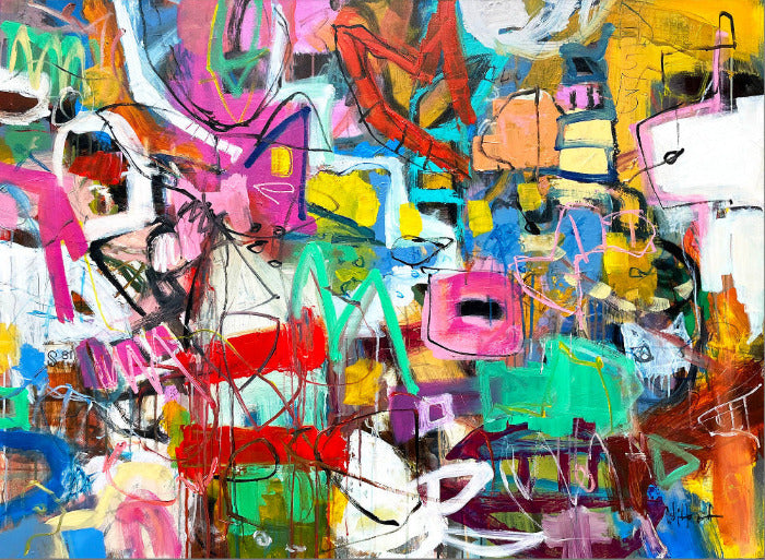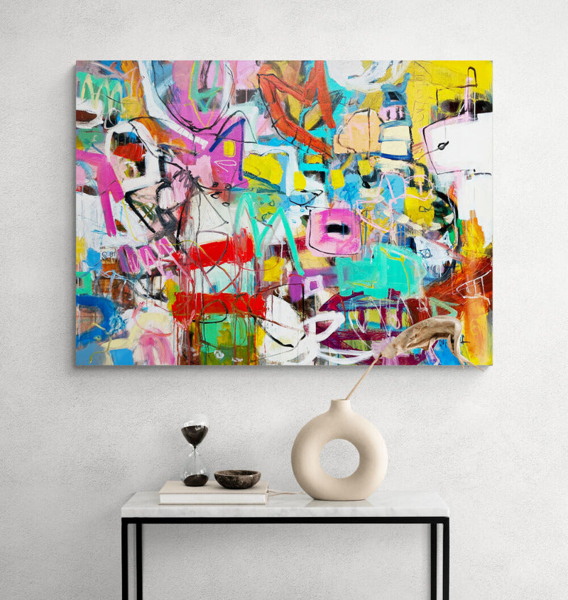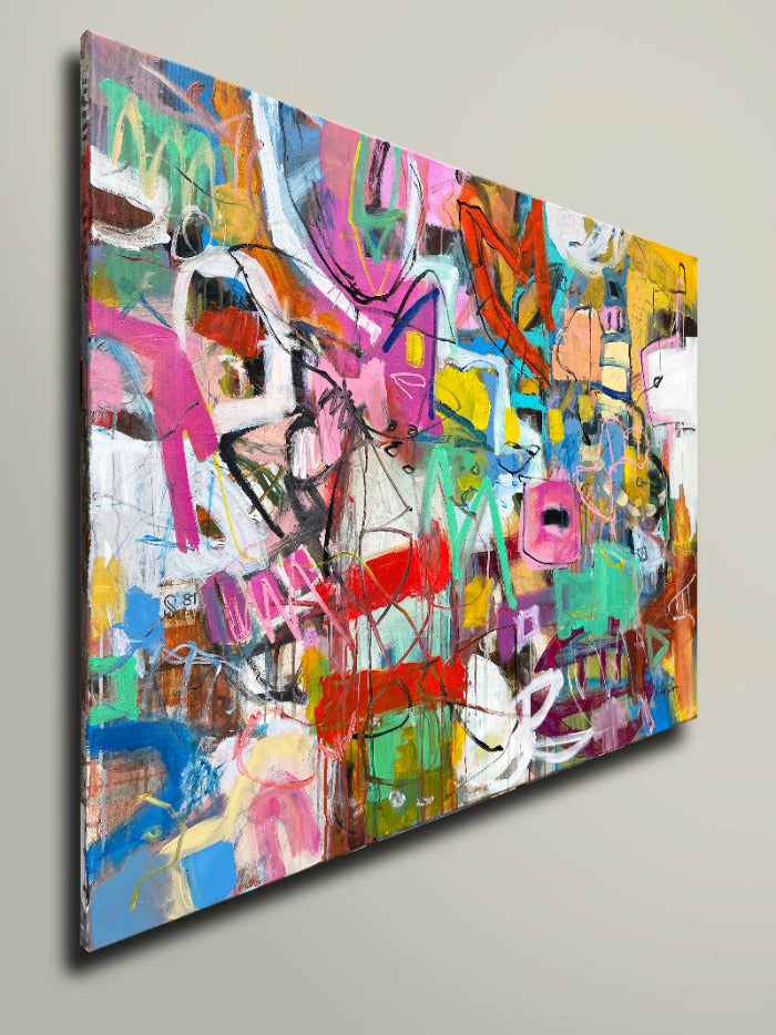 120 x 90 x 1 cm.. Acrylic and mixed media. Celebrating the improvisational aspect of music with this piece, using layers of acrylic ans undercoats of spray paint to find my shapes. and then went over everythings with rythmic and staccato brushwork. Free shipping