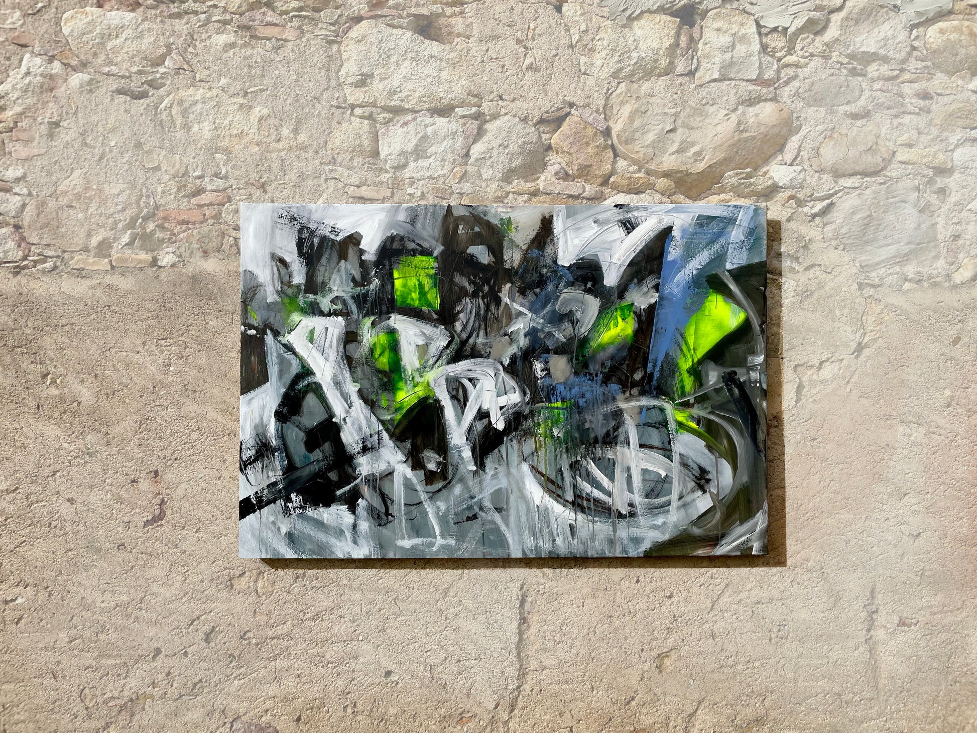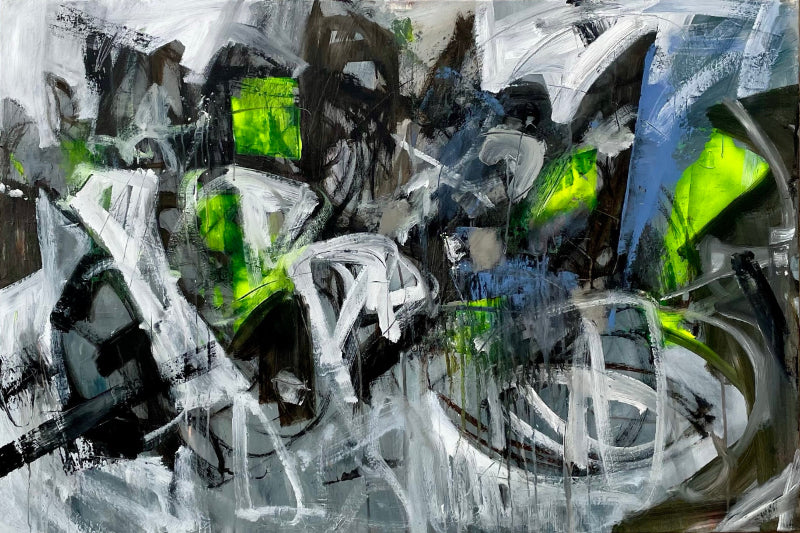 The gestural brushstrokes and layered textures suggest movement, energy, and raw emotion, while the electrifying green hues inject an unexpected vibrancy into the monochrome composition.